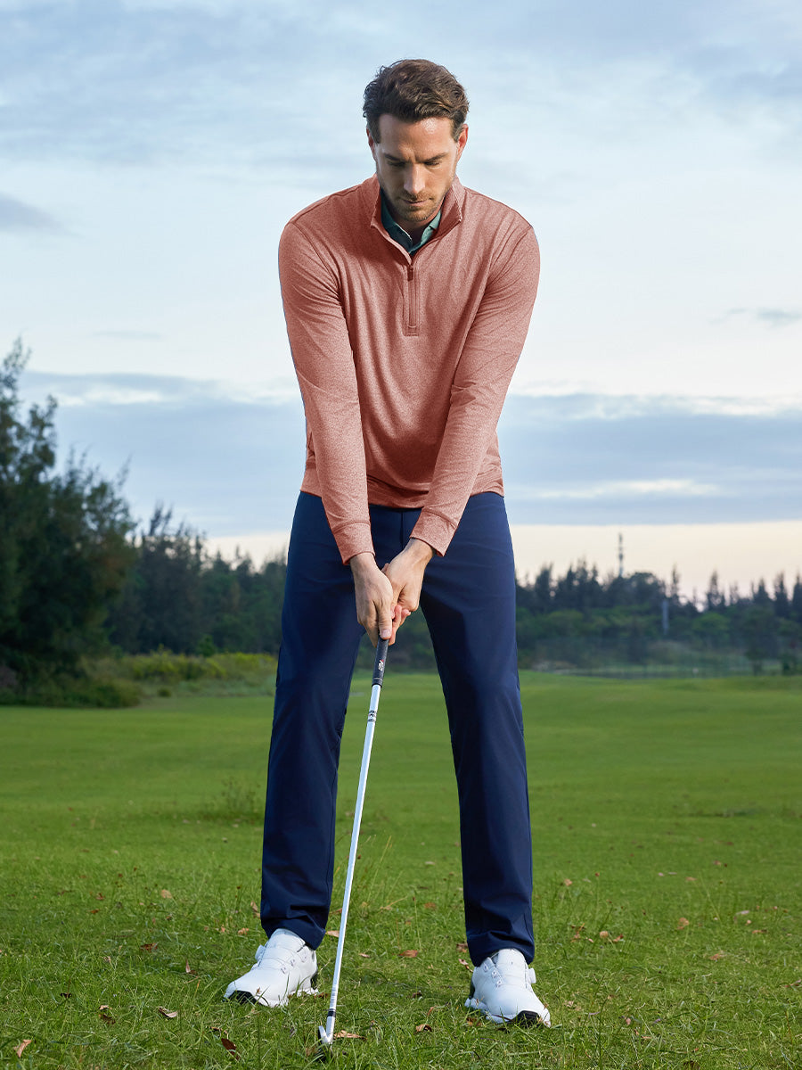 Meet our Quarter Zip Melange Pullover, the ultimate choice for golf aficionados. This men's sweatshirt is all about style and performance, featuring a sleek quarter zip placket with a windproof flap for that modern touch and easy temperature control. Crafted from a high-performance 4-way stretch brushed knit of polyester and spandex, it offers moisture-wicking, lightweight, and breathable comfort, ensuring you move with ease and style on the golf course. Elevate your game with comfort and sophistication!