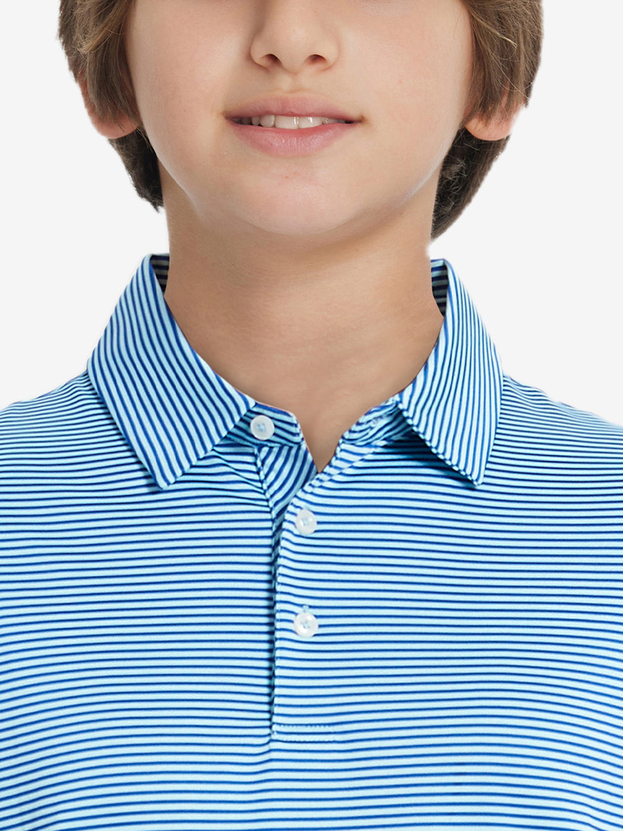 Performance Cooling Polo - Youth crafted from polyester spandex striped jersey. Lightweight, moisture-wicking, quick-drying, UPF 30+, soft hand-feel, 4-way stretch for comfort and breathability. Special construction ensures a no-curl collar and maintains shape.