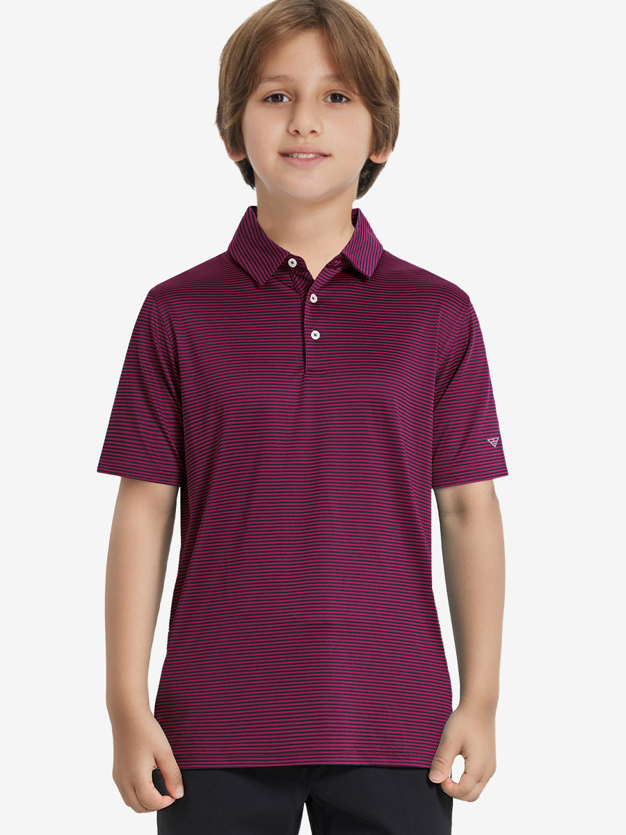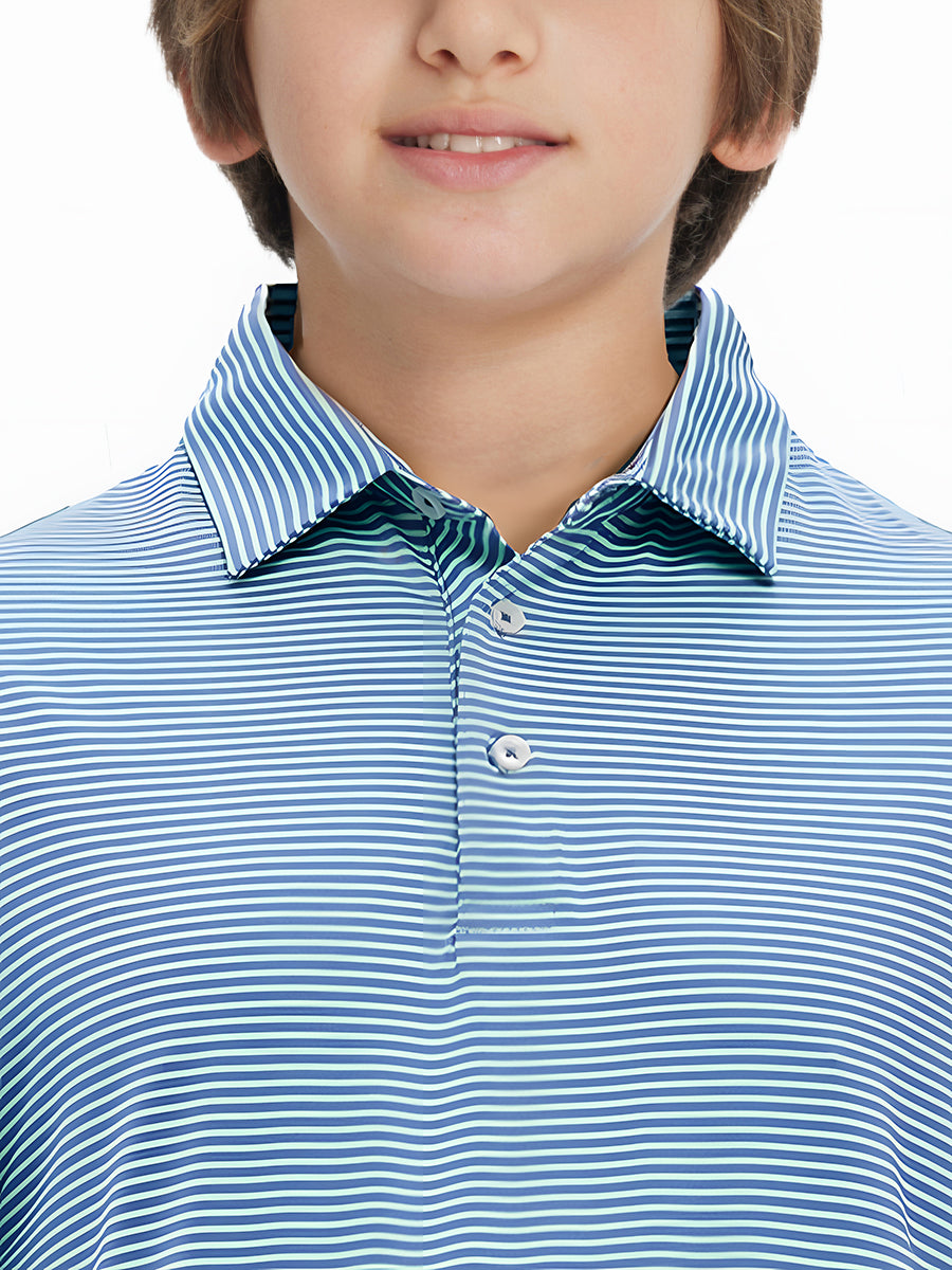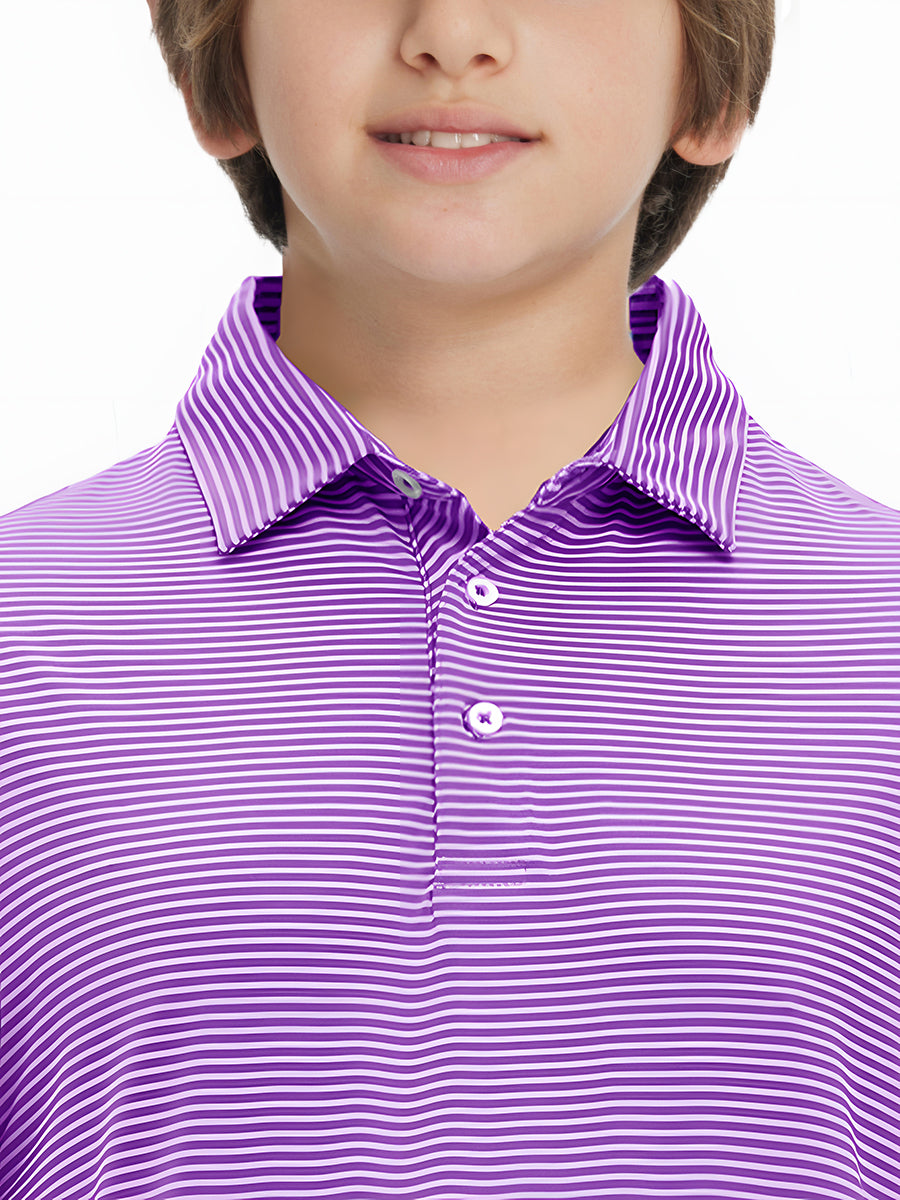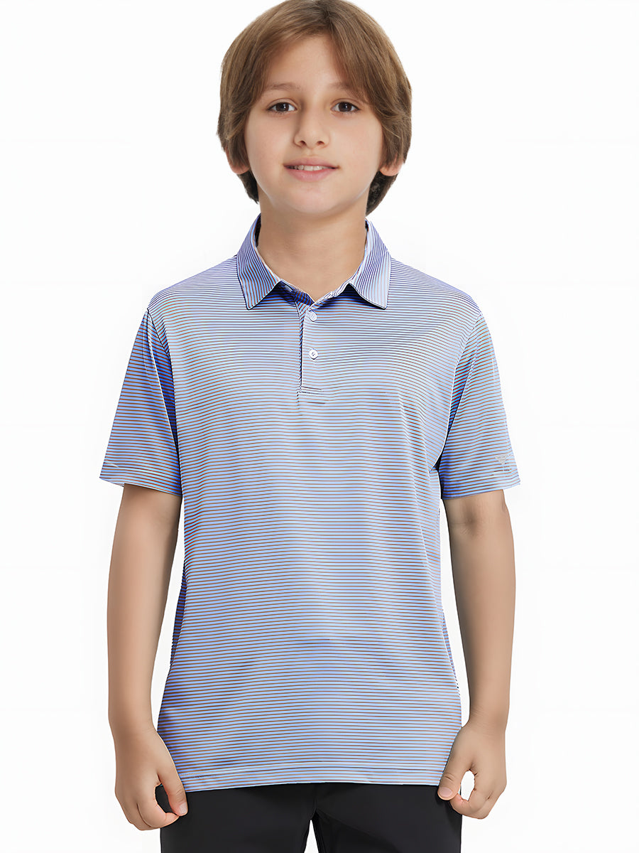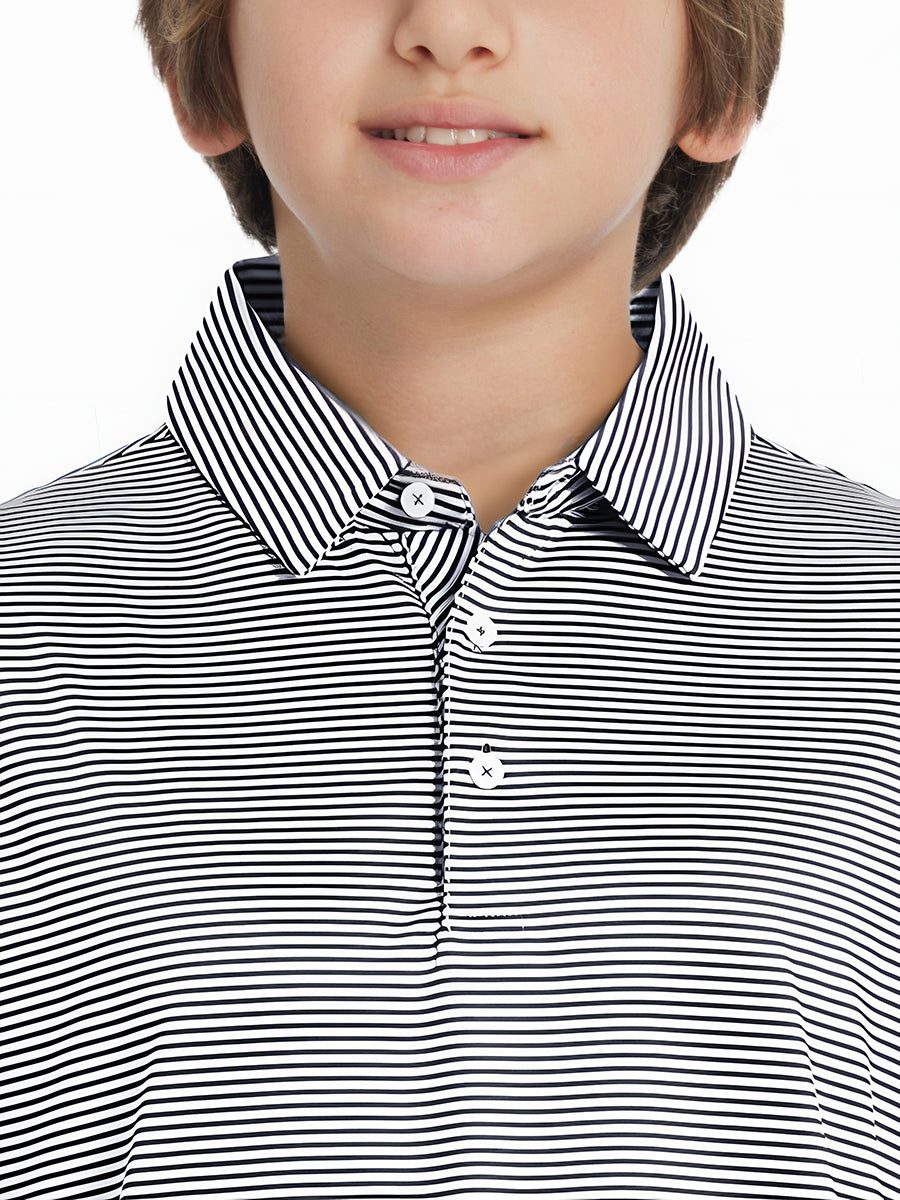 Polos de golf a rayas para niños confeccionados en jersey a rayas de poliéster spandex. Ligeros, absorben la humedad, de secado rápido, UPF 50+, tacto suave, elásticos en 4 direcciones para mayor comodidad y transpirabilidad. La confección especial asegura un cuello que no se enrolla y mantiene su forma.