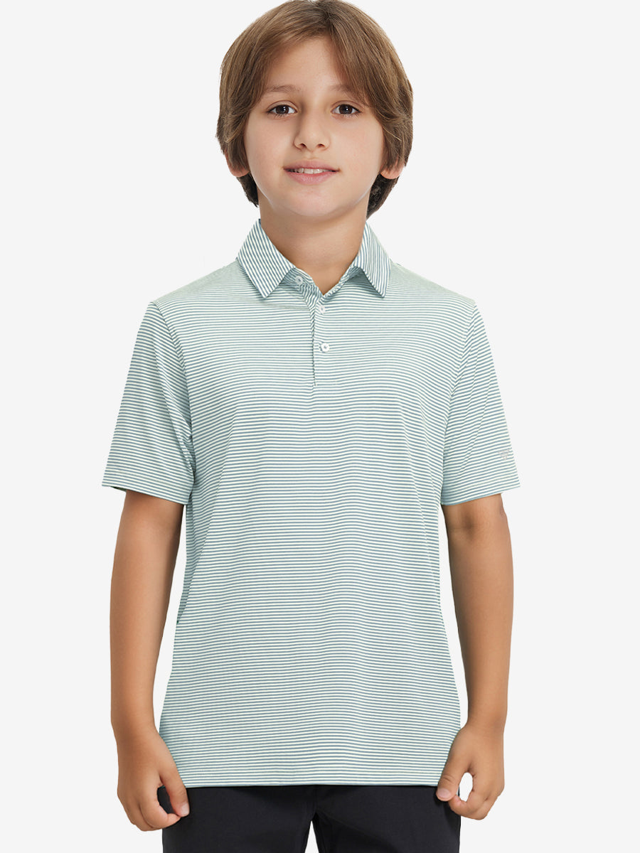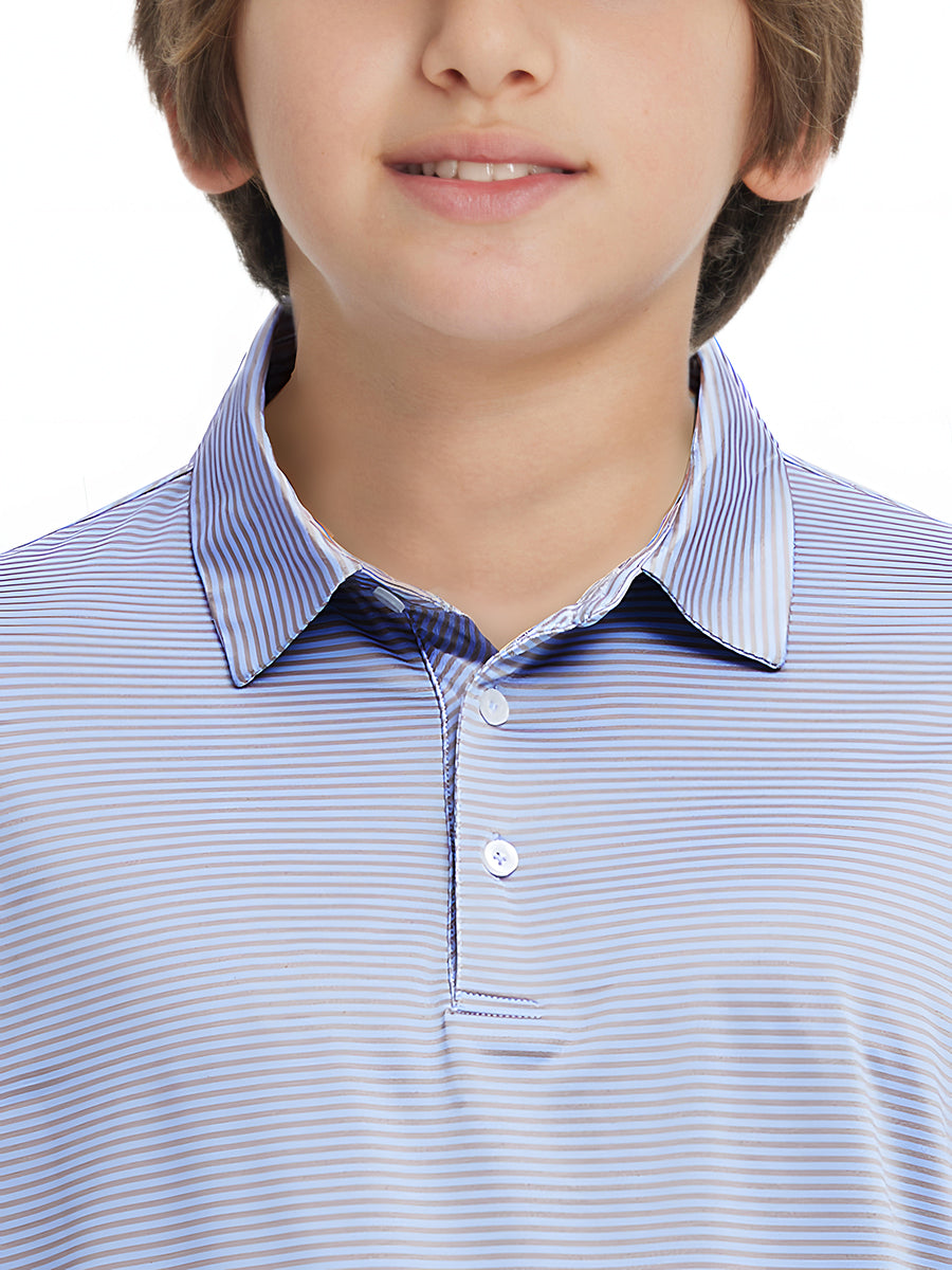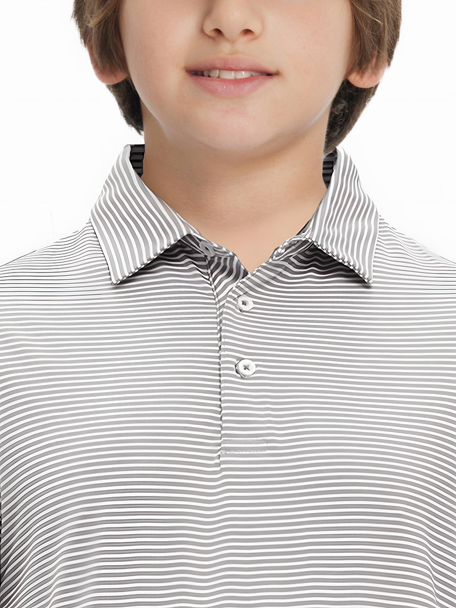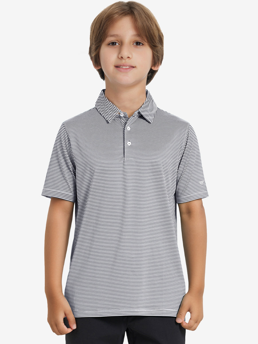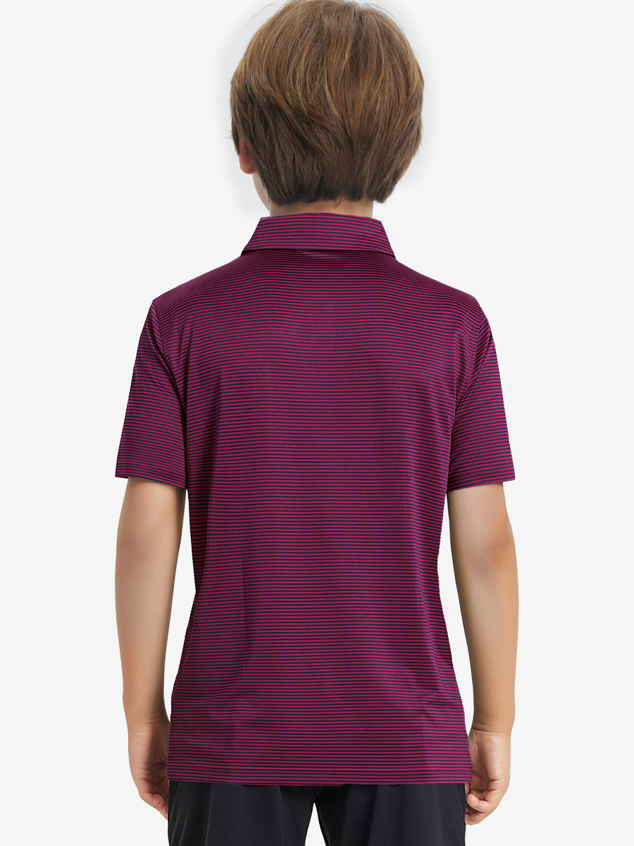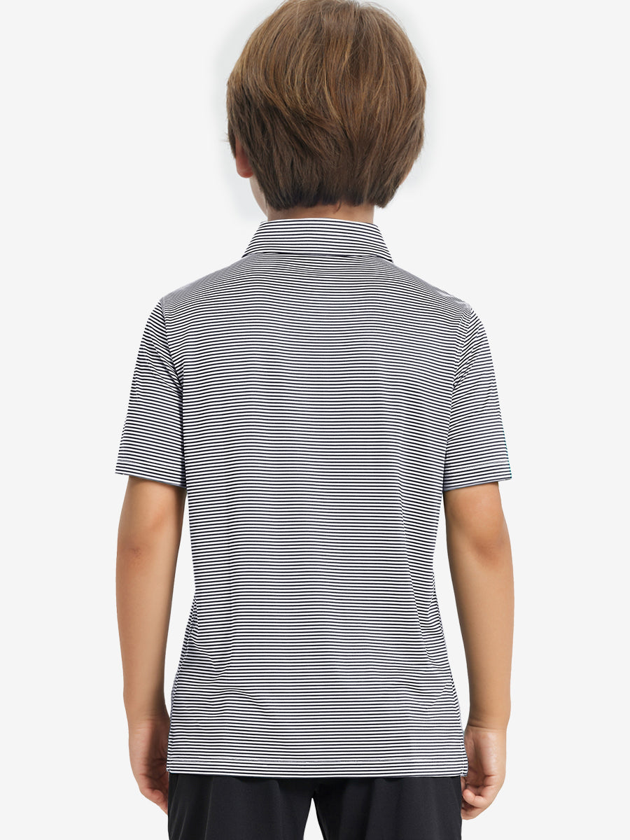 Polos de golf a rayas para niños confeccionados en jersey a rayas de poliéster spandex. Ligeros, absorben la humedad, de secado rápido, UPF 50+, tacto suave, elásticos en 4 direcciones para mayor comodidad y transpirabilidad. La confección especial asegura un cuello que no se enrolla y mantiene su forma.