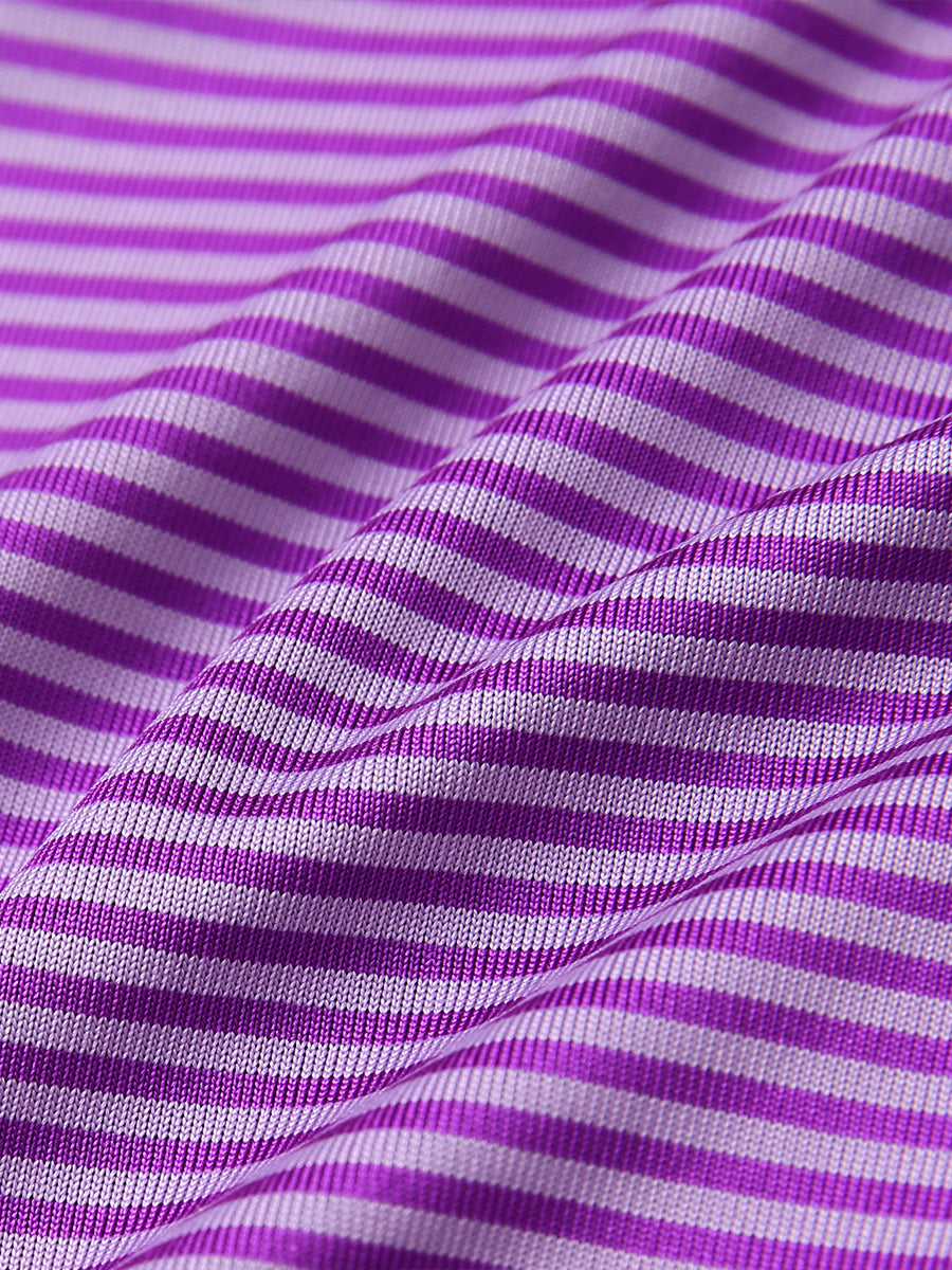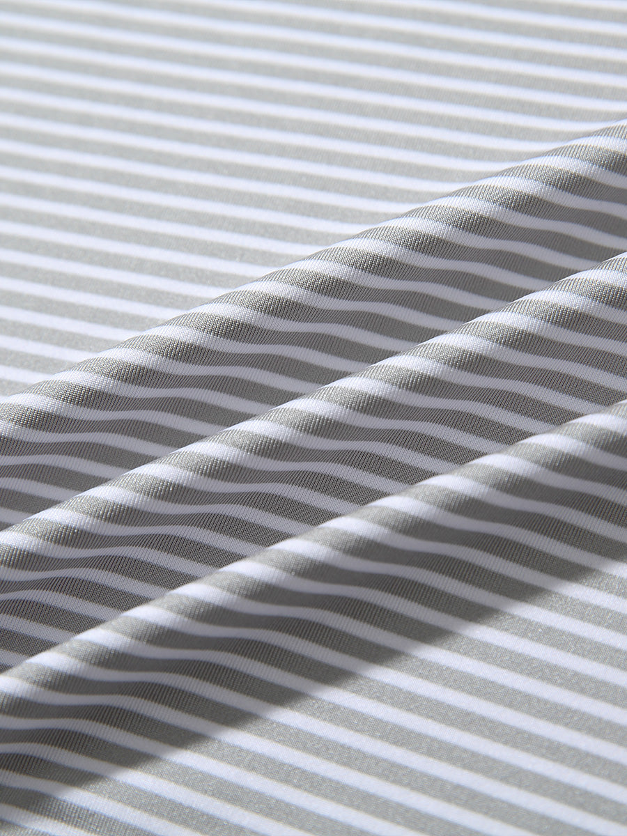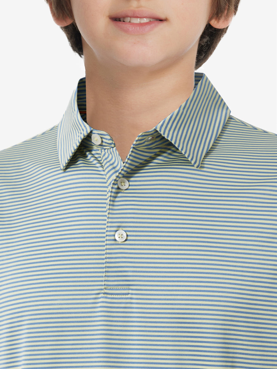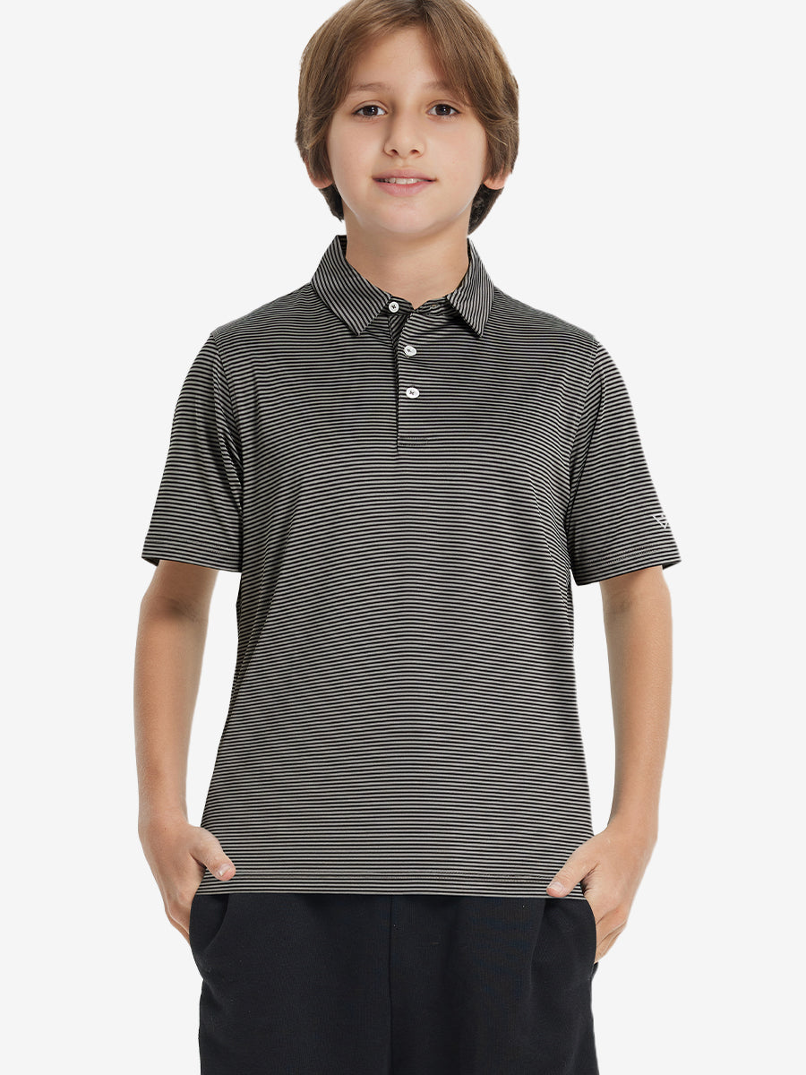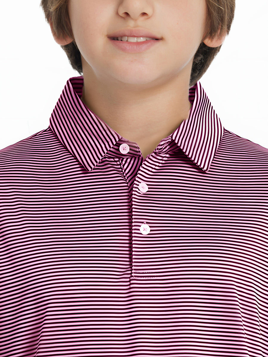 Polos de golf a rayas para niños confeccionados en jersey a rayas de poliéster spandex. Ligeros, absorben la humedad, de secado rápido, UPF 50+, tacto suave, elásticos en 4 direcciones para mayor comodidad y transpirabilidad. La confección especial asegura un cuello que no se enrolla y mantiene su forma.