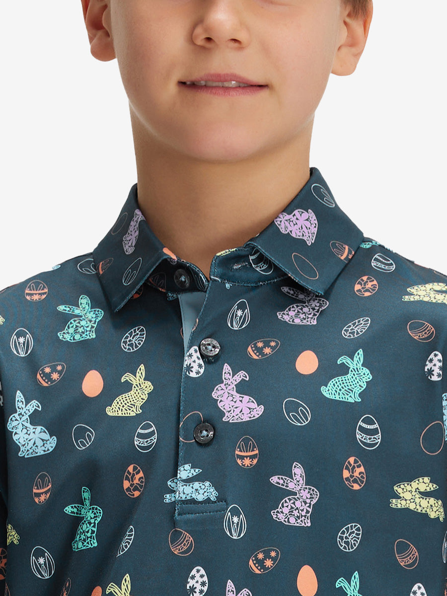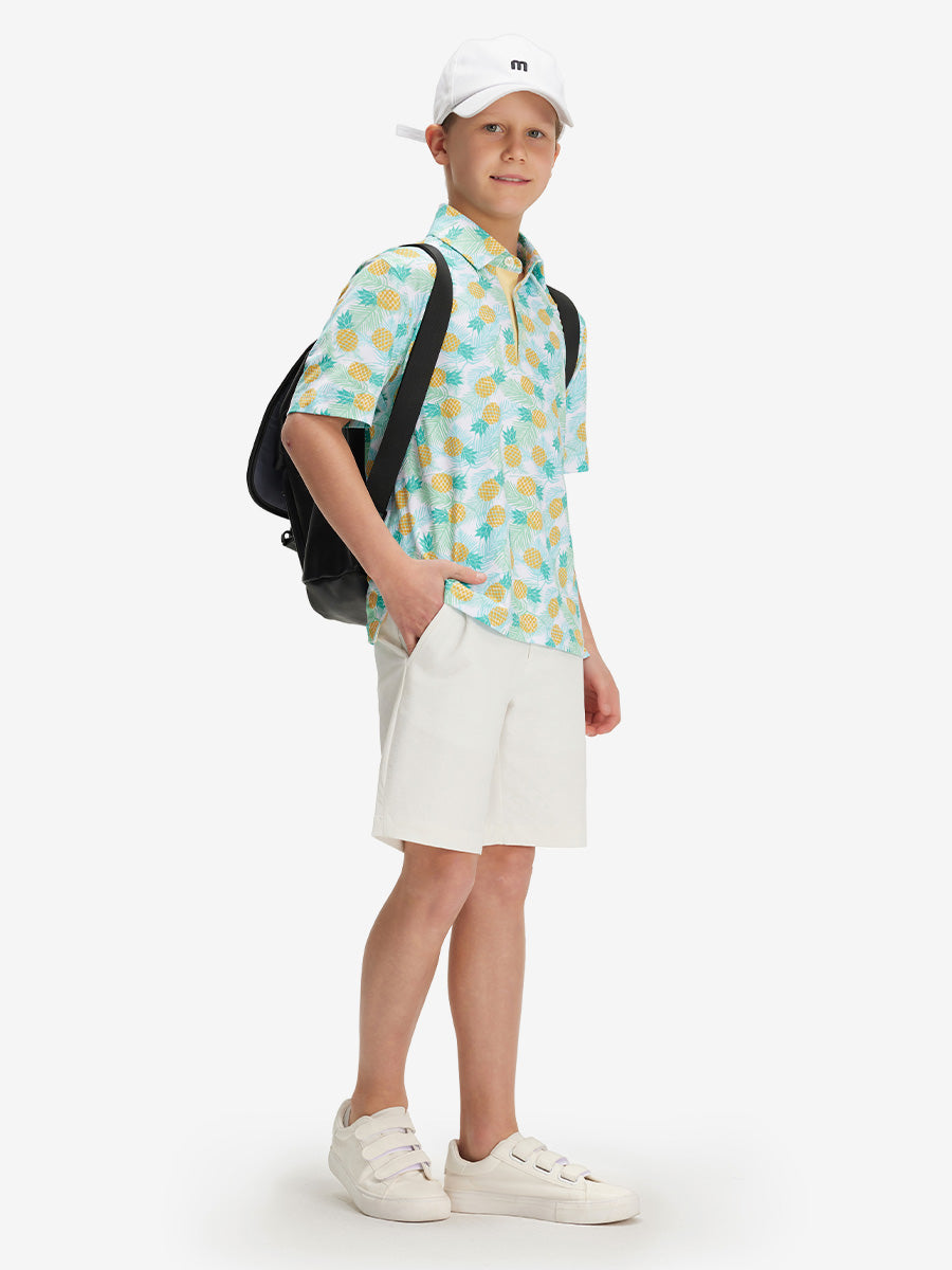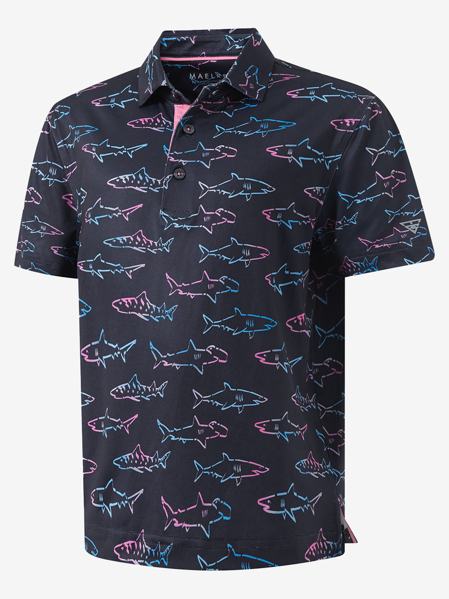 Get your little golfer ready for adventures with our Performance Print Boys Golf Polo. Crafted from top-notch fabric that wicks moisture, stays light, and shields with UPF 50+. Let him swing freely with the split hem and stretchy fabric. Watch him rock the course in fun animal and plant prints that never fade, making him the cutest golfer around!