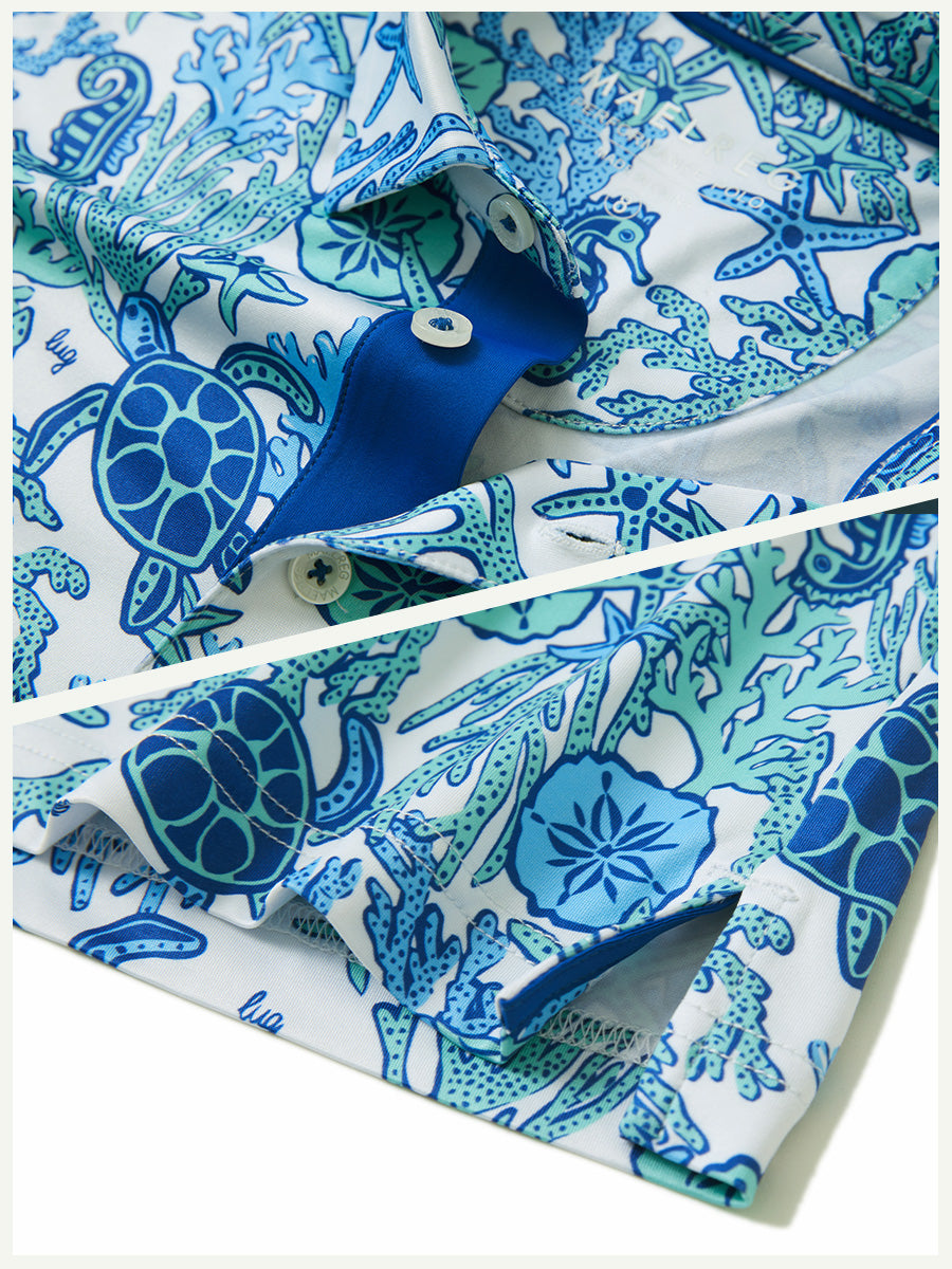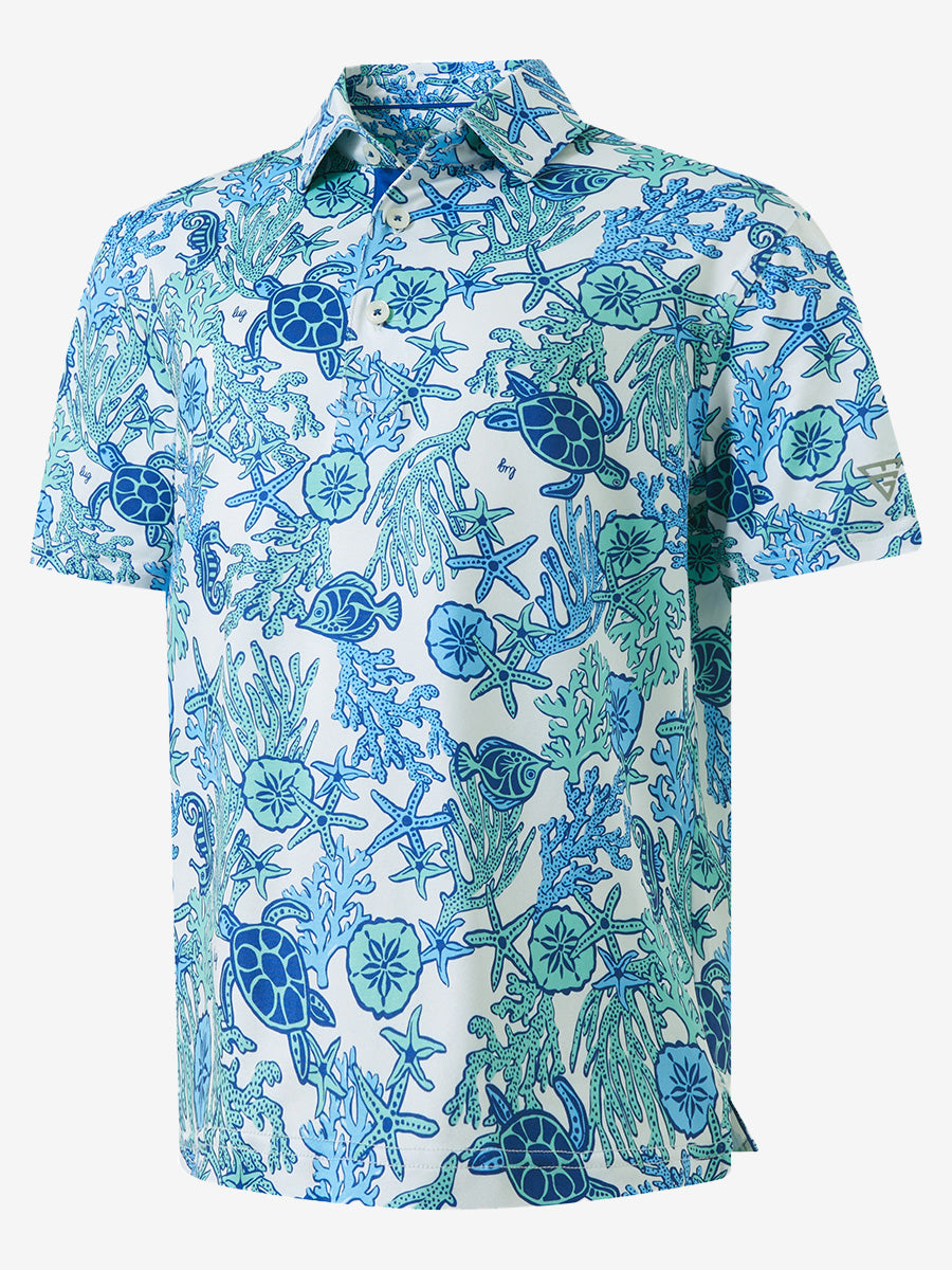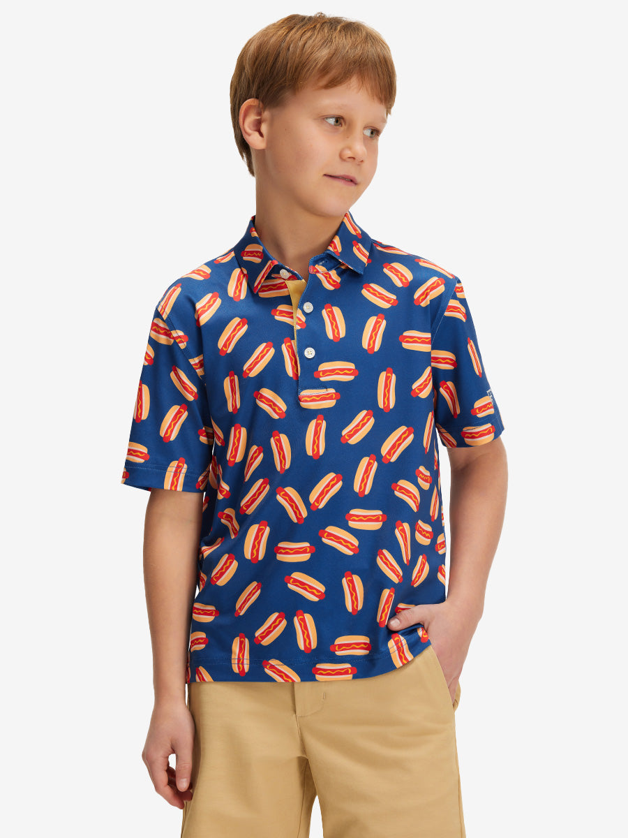 Get your little golfer ready for adventures with our Performance Print Boys Golf Polo. Crafted from top-notch fabric that wicks moisture, stays light, and shields with UPF 50+. Let him swing freely with the split hem and stretchy fabric. Watch him rock the course in fun animal and plant prints that never fade, making him the cutest golfer around!