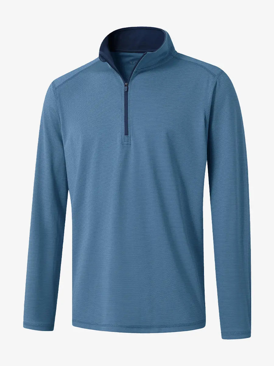 Our men's quarter zip pullover is made from high-quality yarn-dyed striped polyester, offering moisture-wicking, breathability, UPF30+ protection, and 4-way stretch for ultimate comfort. The stylish design features a 1/4 zipper for easy wear and a mock neck for UV protection and warmth. Ideal for outdoor activities and athletic performance.