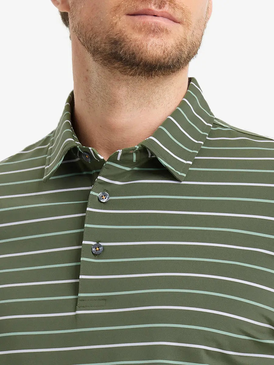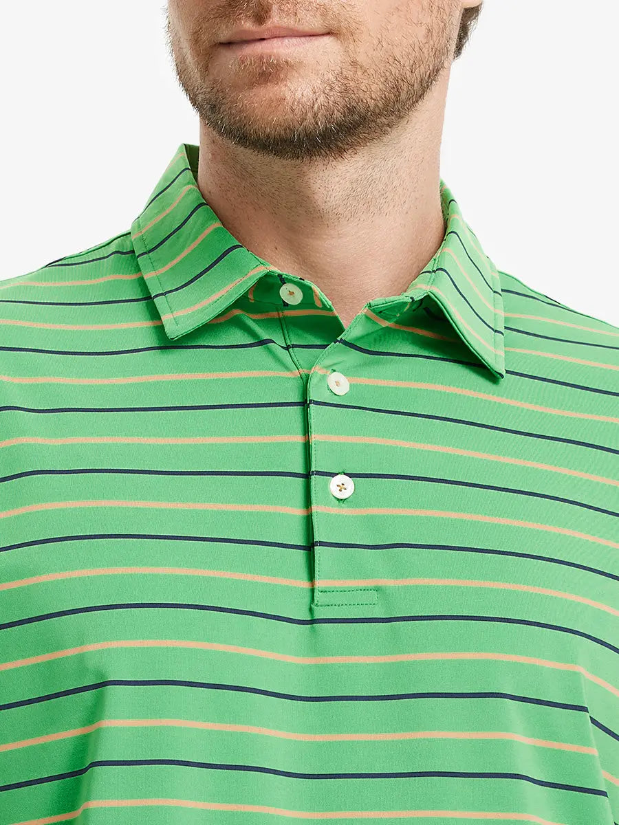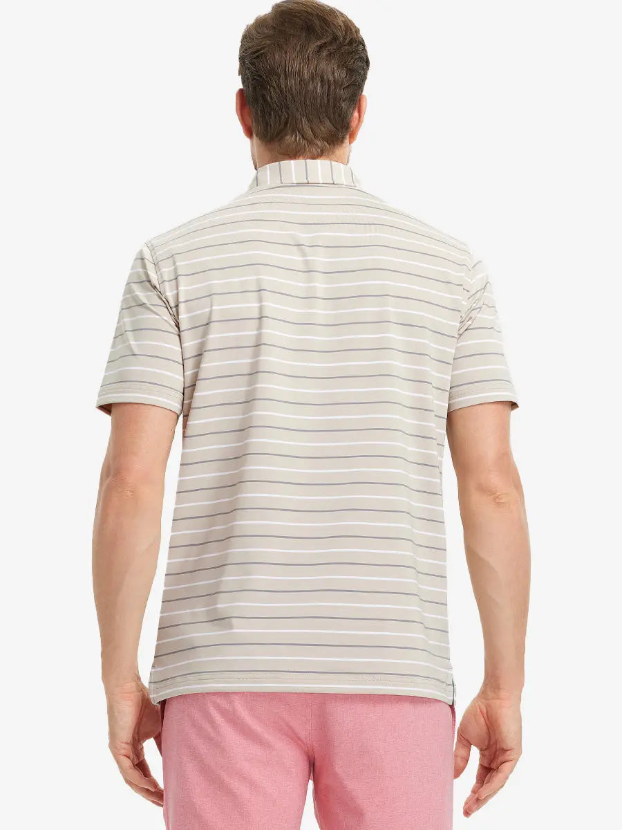 Our men's golf shirt features yarn-dyed stripes and is made from high-end polyester-spandex material, providing softness and breathability. It effectively wicks moisture to keep you cool and dry. With 4-way stretch fabric, this polo ensures full range of motion for any golfer. Ideal for the course or casual wear.