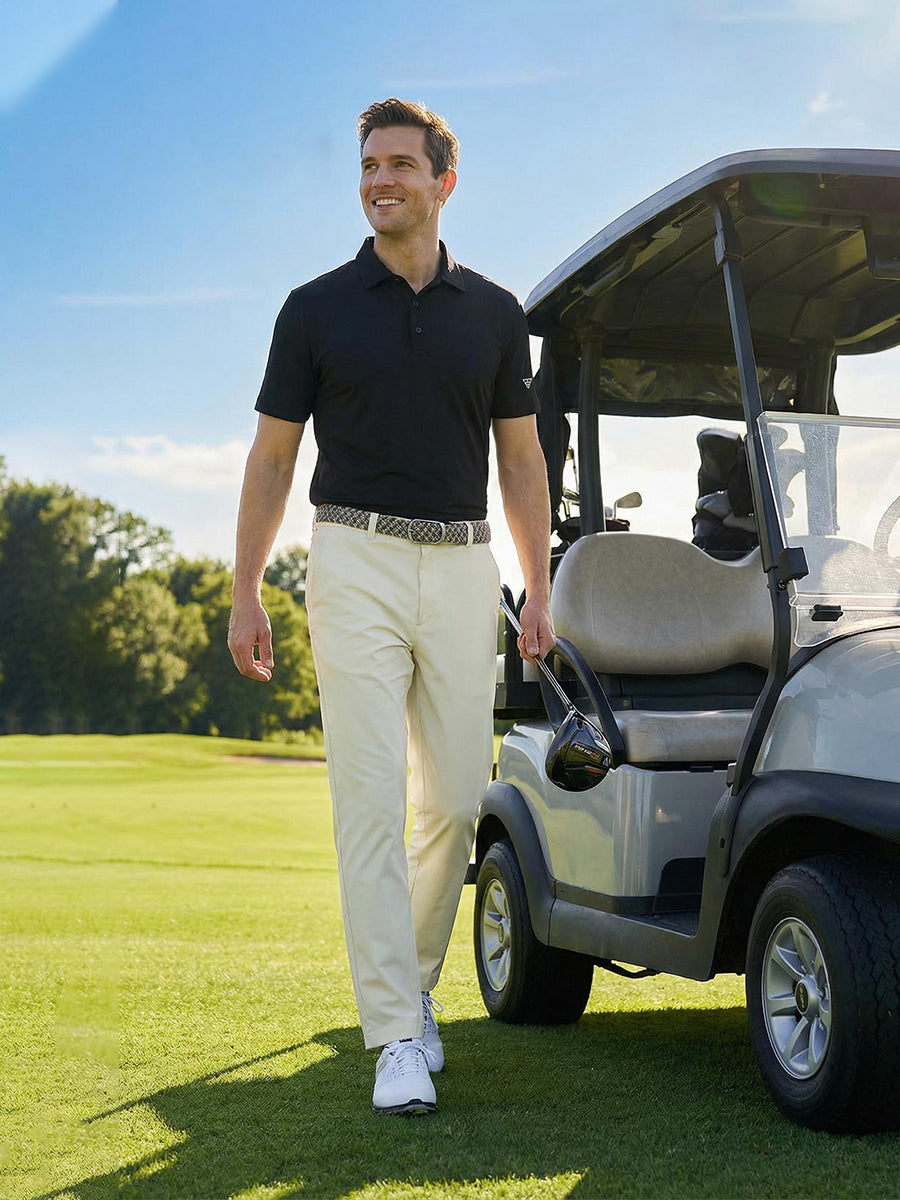 Introducing our Water Resistant Everyday Pants for men. Crafted from premium polyester chino fabric, these pants offer a luxurious feel with features such as moisture-wicking, UPF30+, and water-resistant properties. Designed with a button front and zip-fly closure, they provide both style and comfort for everyday wear.
